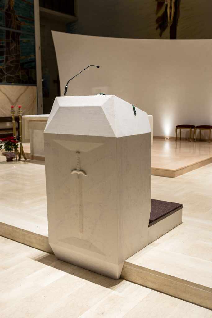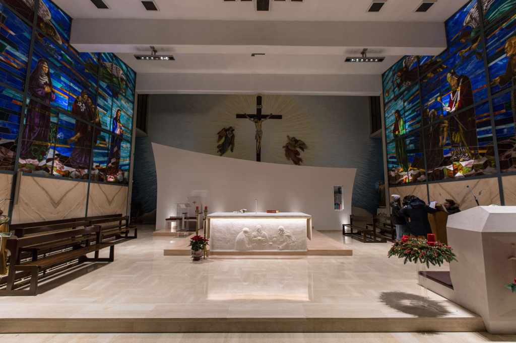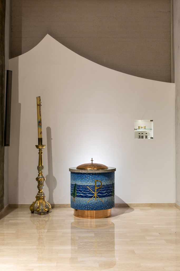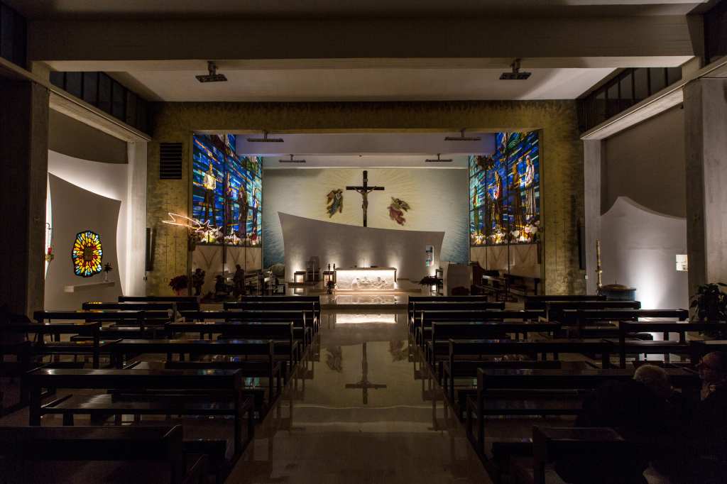 Il valore di questo edificio risiede in una geometria chiara e semplice (sia in pianta che in alzato) che prende corpo nella poeticità delle trame dei materiali. Per questo motivo anche lo studio dell’illuminazione mira a “ripulire” visivamente le superfici e la struttura, dandone un tono caldo e ponendo visivamente e non solo l’attenzione al centro dell’altare.