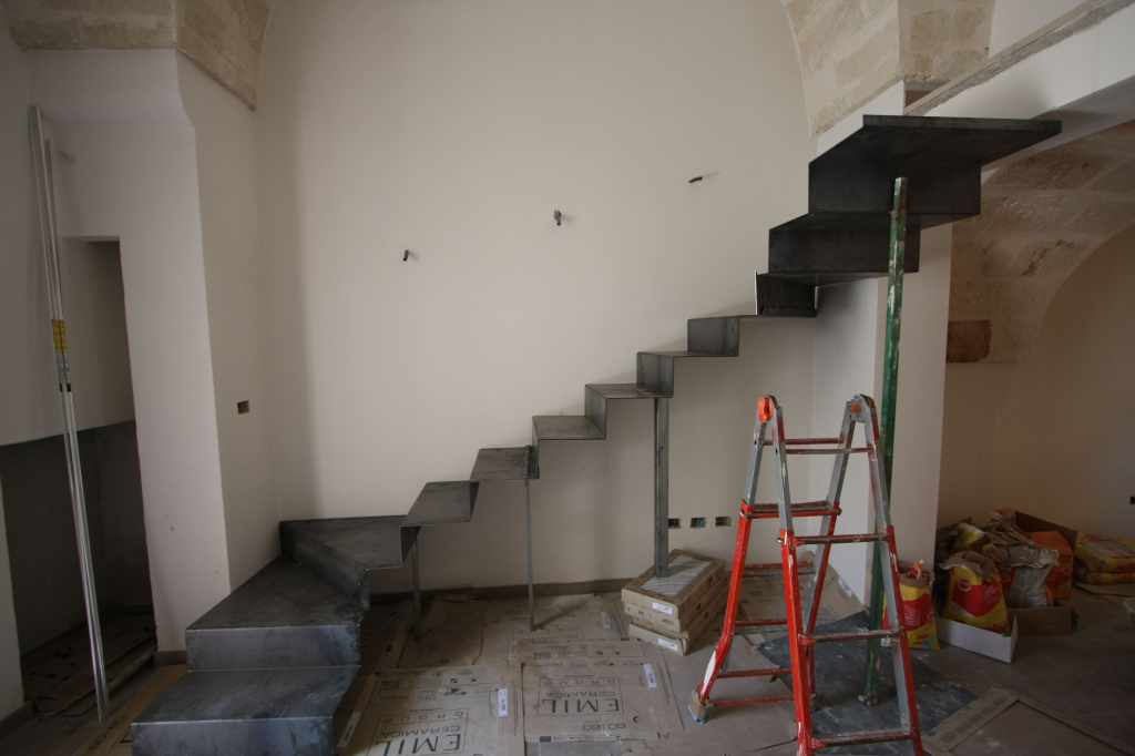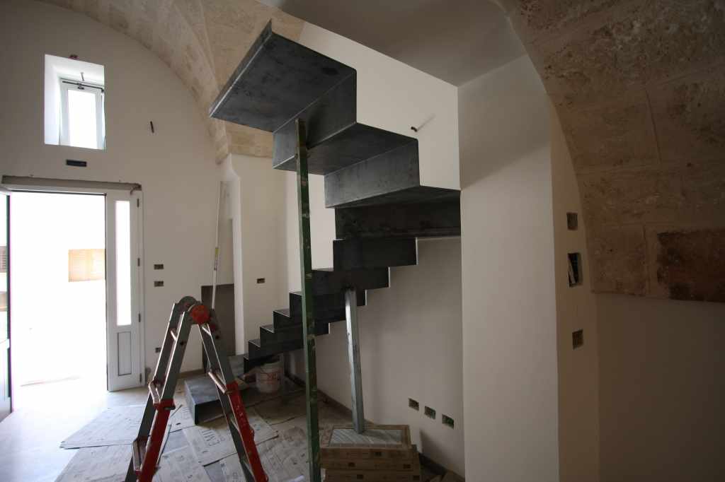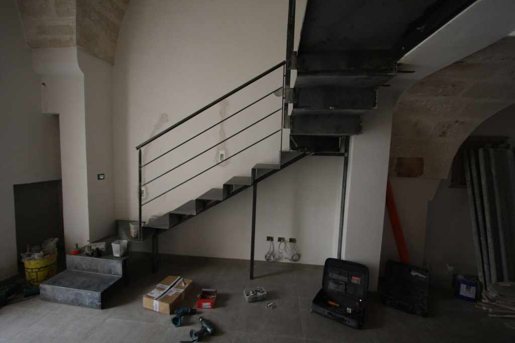 La progettazione tecnica e di design ha investito la struttura e tutti i componenti verso i quali è stata riposta la massima attenzione. Un sottile nastro di metallo si srotola tra due piani, trasformando lo spazio in qualcosa di concettuale. Leggera e ariosa nel suo graduale moto ascensionale. Sul muro grafismi di luce e metallo la rendono nello stesso tempo astratta e materica.